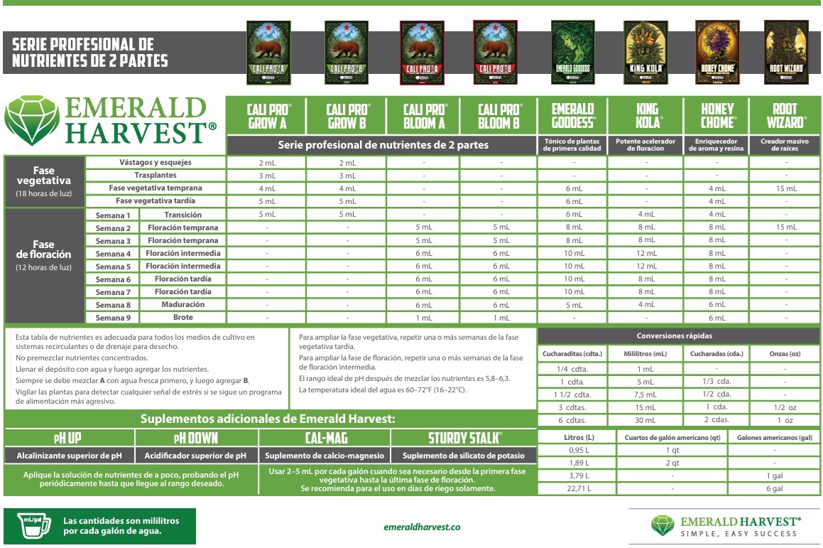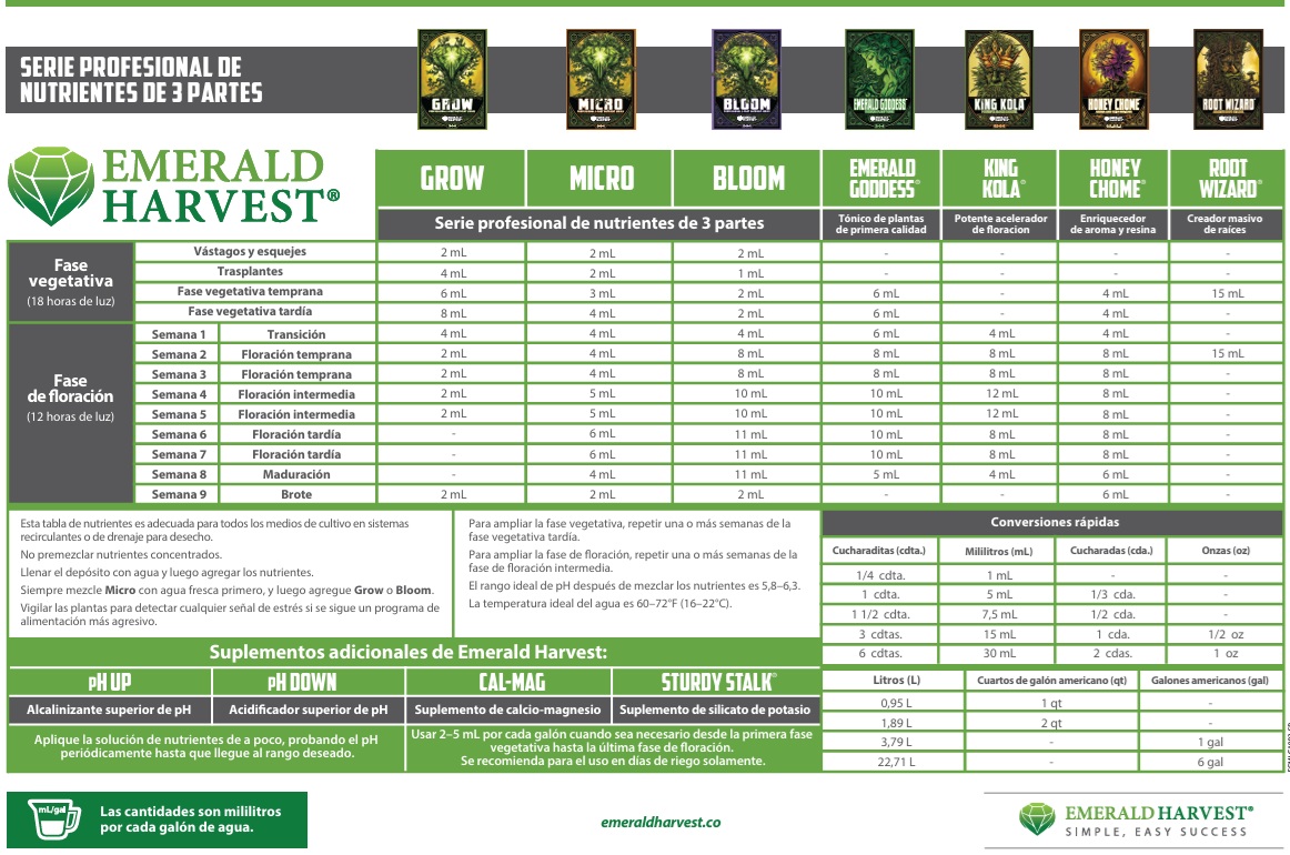 The feeding charts are designed to work with Emerald Harvest’s most popular and effective formulas: