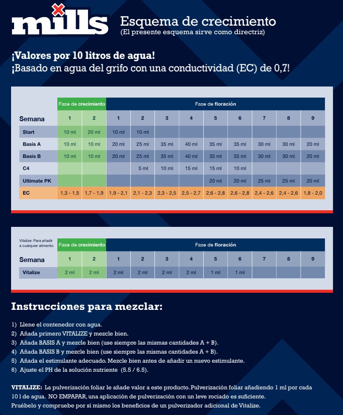 At Whole Green (wholegreen.es), we offer the full set of Mills Nutrients feeding charts, a comprehensive nutrition system based on highly efficient bio‑mineral formulas. These charts guide you from early growth to harvest, adaptable to soil, coco, or hydroponic setups.